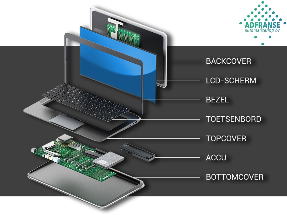 We hopen het natuurlijk niet, maar een laptop kan altijd een keer stukgaan. Dat kan door intensief gebruik, een ongelukje of simpelweg slijtage. Gelukkig kunnen wij u daar prima bij helpen. Om het gesprek over een reparatie of controle zo duidelijk mogelijk te maken, leggen we hieronder uit welke onderdelen een laptop heeft en hoe ze heten. Dat ziet u ook terug op de onderstaande afbeelding.